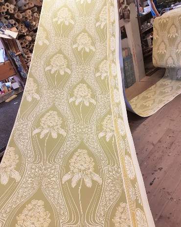 Maison l’Art Nouveau importeert zoals gezegd ook behang van ambachtelijke bedrijfjes uit Scandinavië, zoals bijvoorbeeld van Handtryckta Tapeter uit Långholmen. In deze video kun je goed zien hóe ambachtelijk hun behang wordt geproduceerd. Onder de video enkele voorbeelden van wat zij zoal kunnen maken. Prijzen van dit handgemaakte behang zijn op aanvraag.